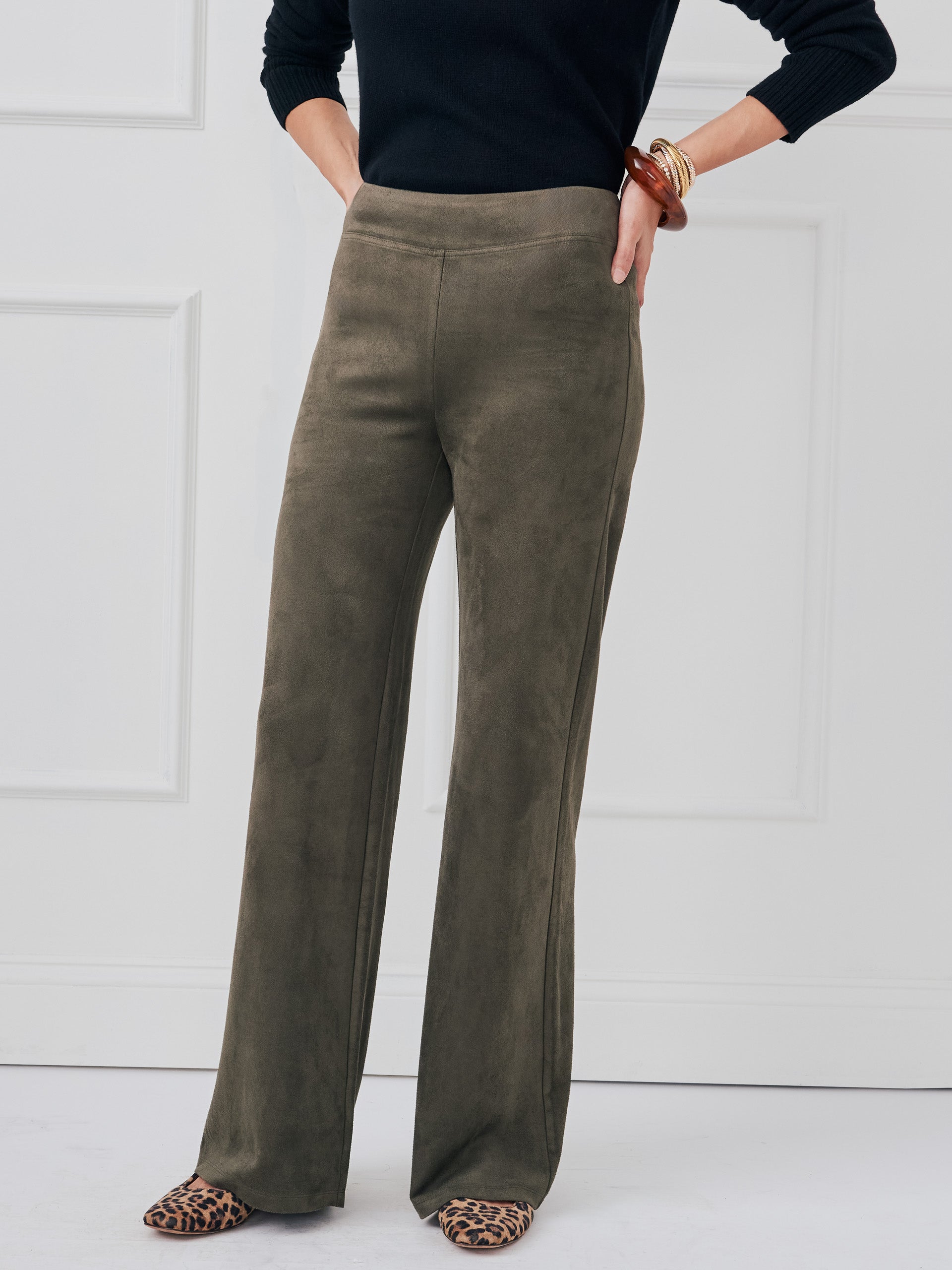 Pull on Elastic waistband Wide leg Faux Suede (92% Polyester, 8% Spandex) Machine wash cold. Tumble dry low. Imported Size & Fit31″ inseam, 11.5″ front rise, 23″ leg opening (size 8) Gabby is 5’9.5″ and wearing a size 0