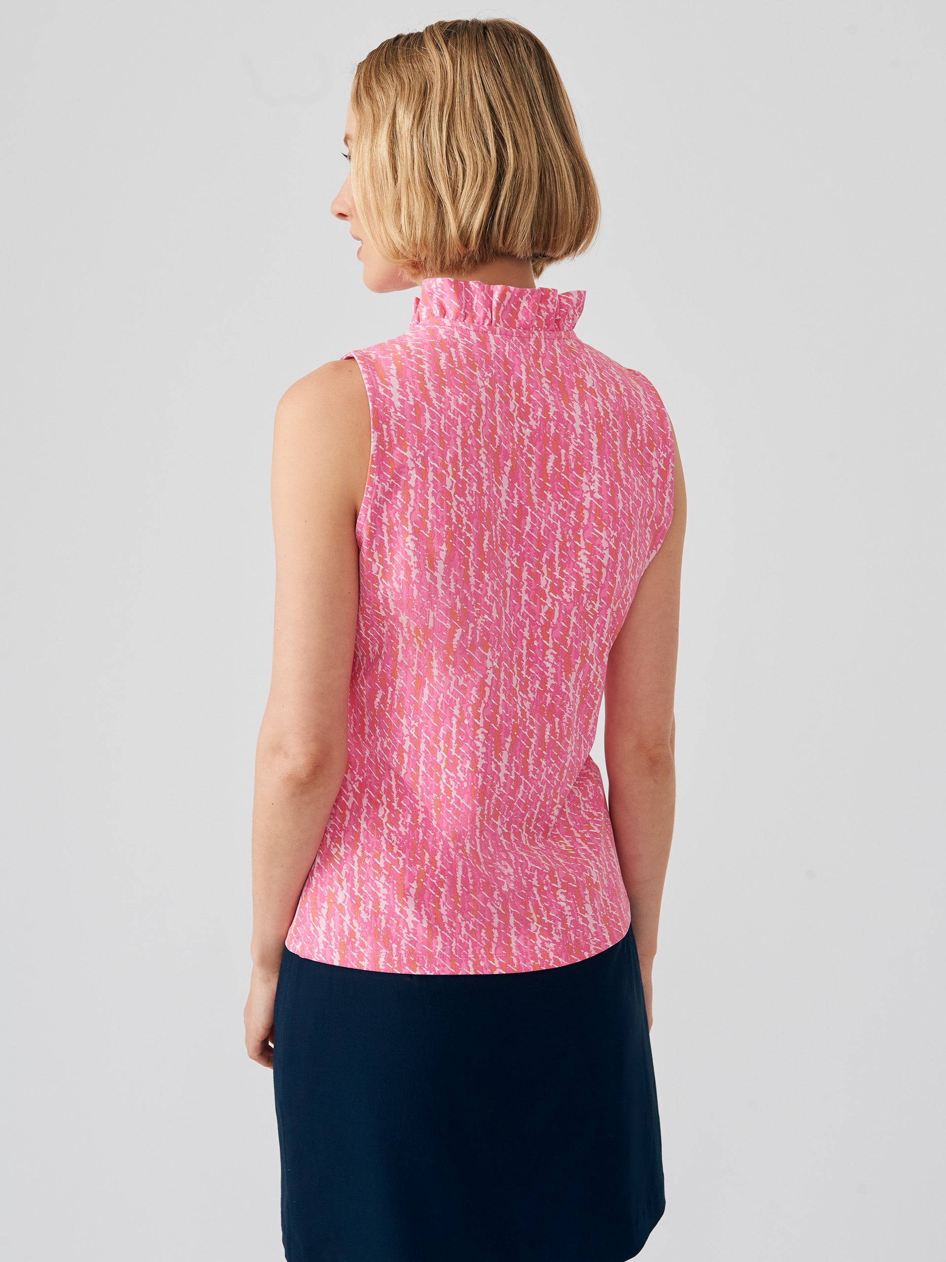 Sleeveless Ruffled placket Catalina Cloth® (JMC Fabric) -91% Nylon, 9% SpandexHand wash cold. Lay flat to dry. Imported. Size & Fit24.5″ long from top of center back (size M) Model is 5’9″ and wearing a size XS