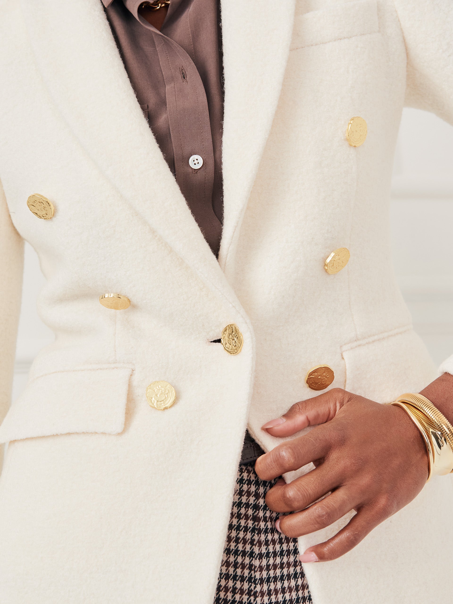 Long sleeves Lapel collar Double breasted blazer Single center button closure Back vent Bouclé Wool Blend (52% Wool, 48% Tencel) Lined Dry clean only. Imported Size & Fit26″ length, 25″ sleeve (size M) Model is 5’9″ and wearing a size XS