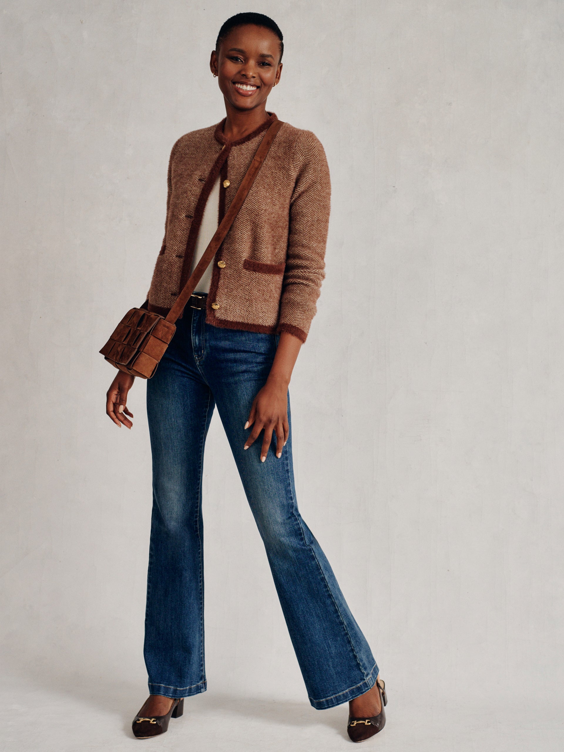 We’ve taken the classic cardigan and elevated it with special details, from the herringbone pattern, to the soft eyelash knit, to the gold tone crest buttons. It’s a must-have piece that goes everywhere, beautifully.