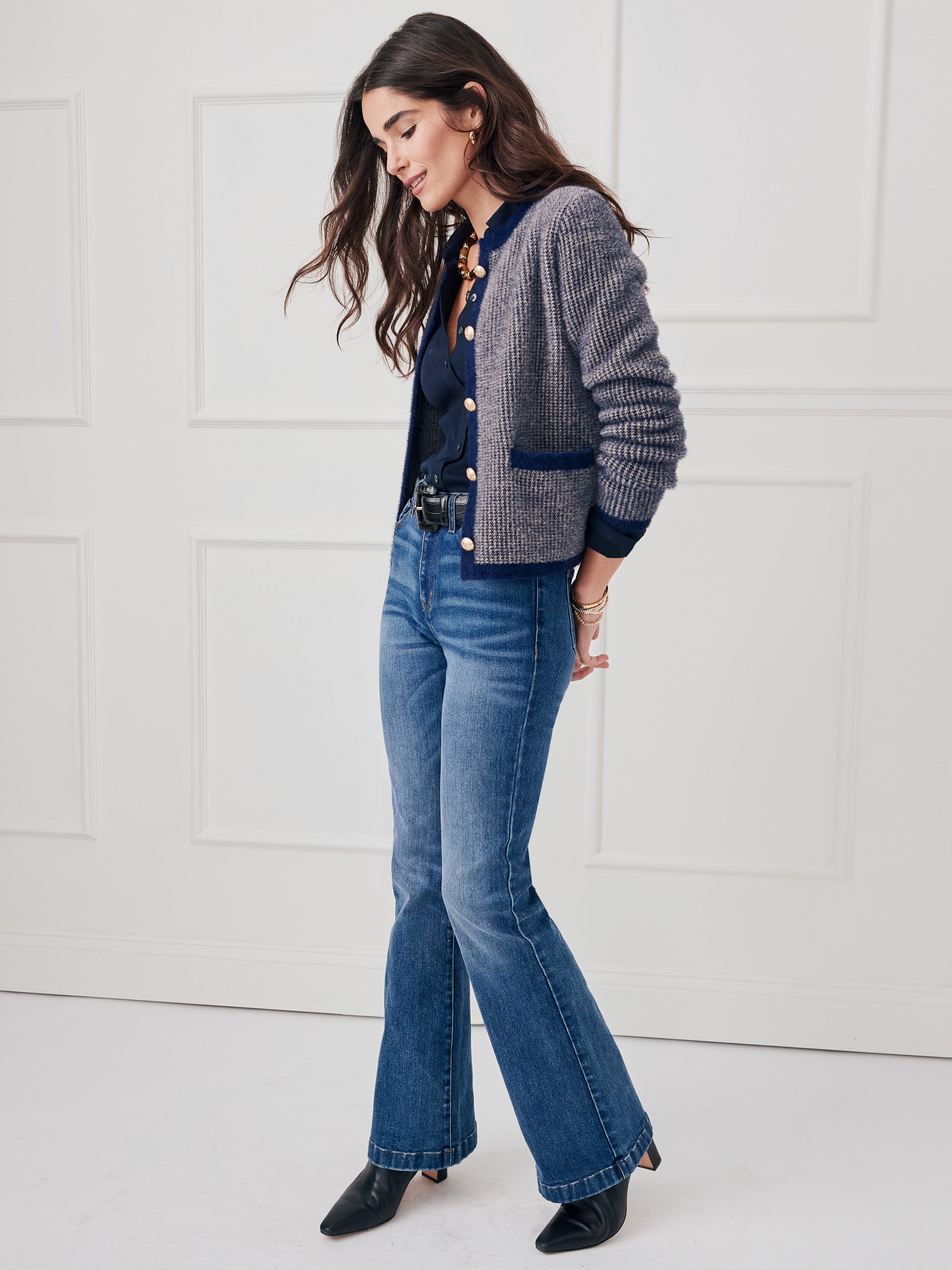 We’ve taken the classic cardigan and elevated it with special details, from the herringbone pattern, to the soft eyelash knit, to the gold tone crest buttons. It’s a must-have piece that goes everywhere, beautifully.