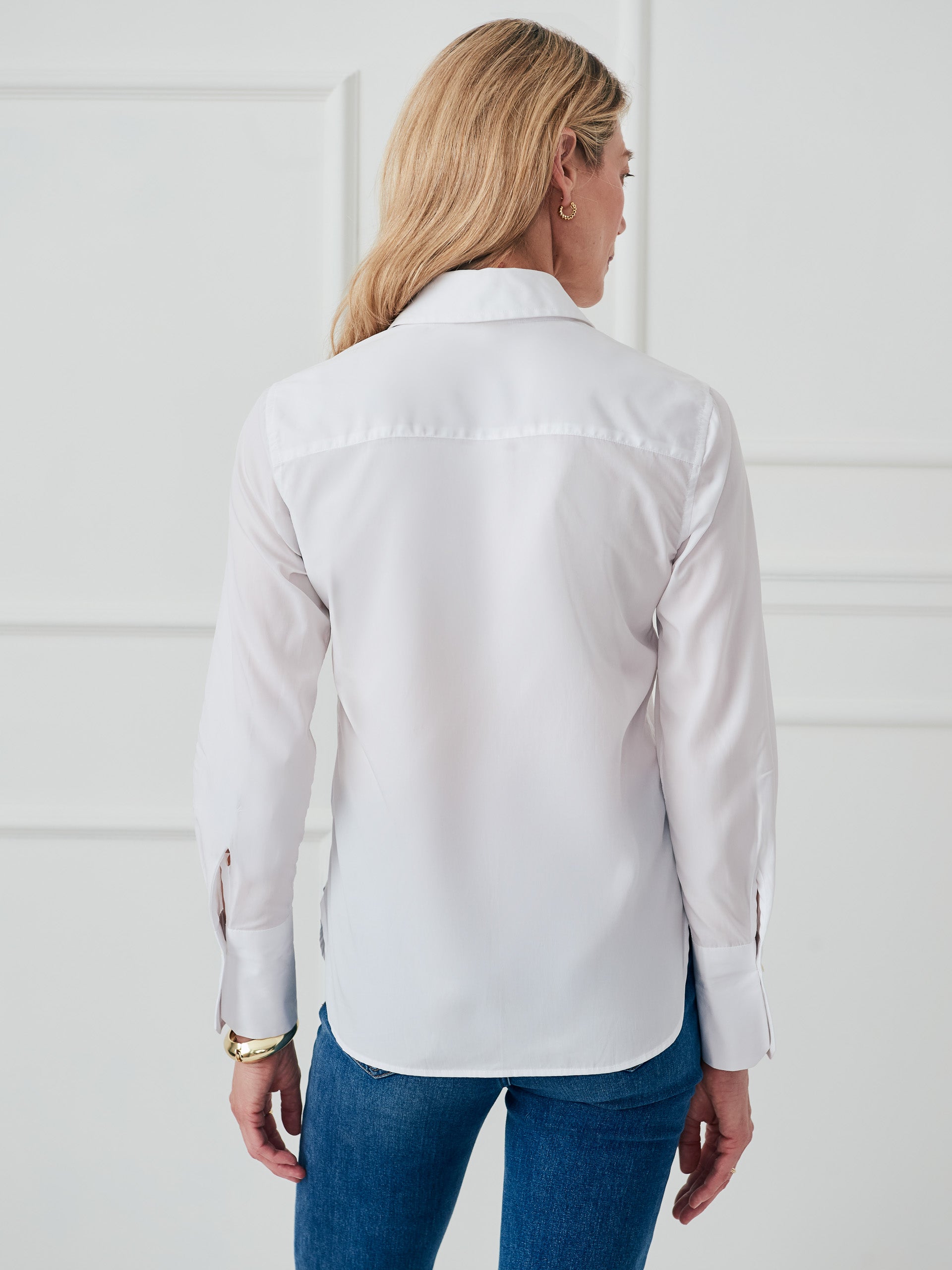 Long sleeves Shirt collar Button down Wide cuffs 100% Cotton Poplin Machine wash cold. Tumble dry low. Imported. Size & Fit26 1/2″ long from top of center back (size M) Model is 5’9″ and wearing a size XS